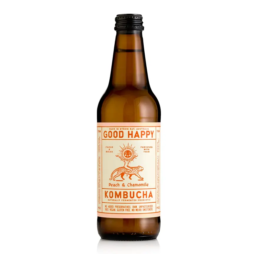 Ingredients: Raw Kombucha (Purified Water, Oolong tea*, Jasmine Tea*, Kombucha Culture), Peach Juice 8%, Evaporated Cane Juice*, Tulsi* 0.1%, Chamomile*, Vanilla*, Cinnamon* (*Certified Organic)
