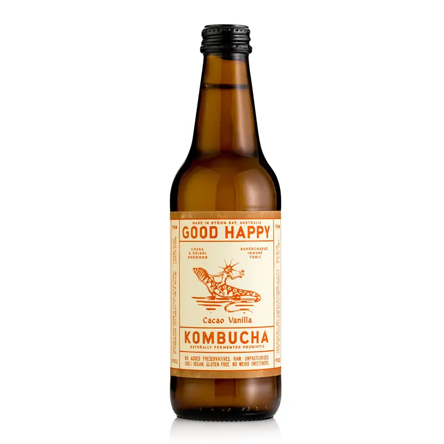 This cacao vanilla kombucha is a naturally fermented probiotic drink with organic cacao and green tea. No added preservatives. Raw. Unpasteurised. Vegan. Gluten Free.
