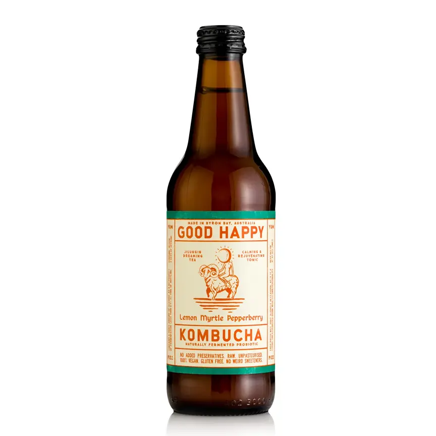 A naturally fermented probiotic kombucha with organic Lemon Myrtle and Tasmanian Pepperberry. No added preservatives. Raw. Unpasteurised. Vegan. Gluten Free.